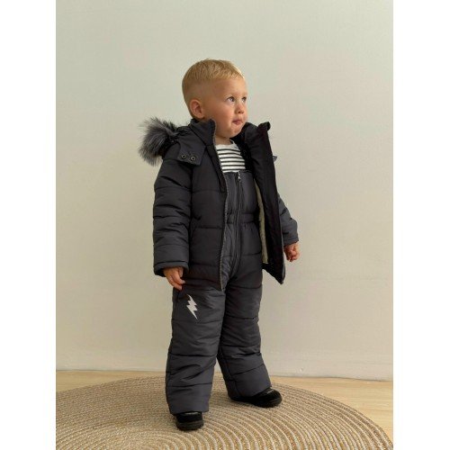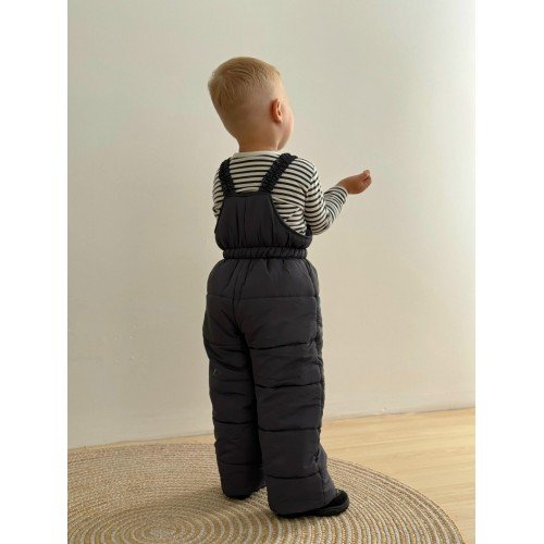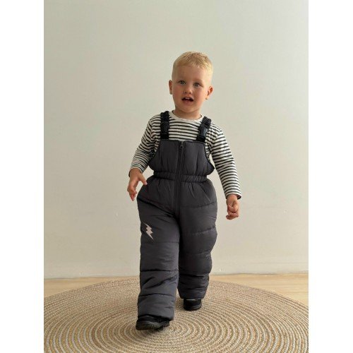Штани-напівкомбінезон усередині на силіконі - 200 г/м², який утримує тепло та дає можливість вільно та швидко переміщатися. Бретели із застібками "фастекс", які додатково регулюють висоту посадки. У штанинах допускається підкат, який також служить захистом від задування і може використовуватися, як регулятор зростання дитини + в штанах є захист від попадання снігу.