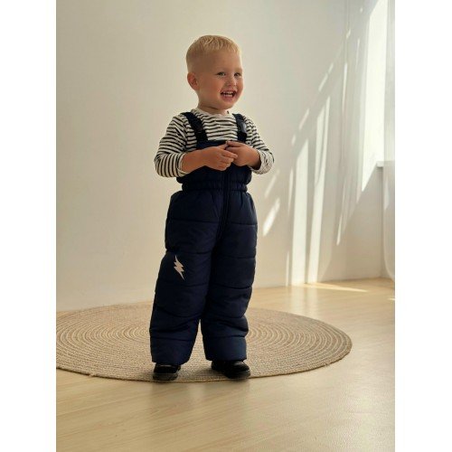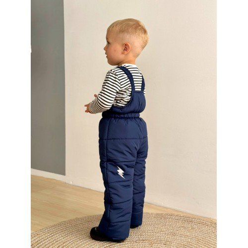 Штани-напівкомбінезон усередині на силіконі - 200 г/м², який утримує тепло та дає можливість вільно та швидко переміщатися. Бретели із застібками "фастекс", які додатково регулюють висоту посадки. У штанинах допускається підкат, який також служить захистом від задування і може використовуватися, як регулятор зростання дитини + в штанах є захист від попадання снігу.